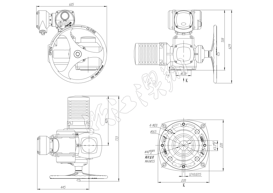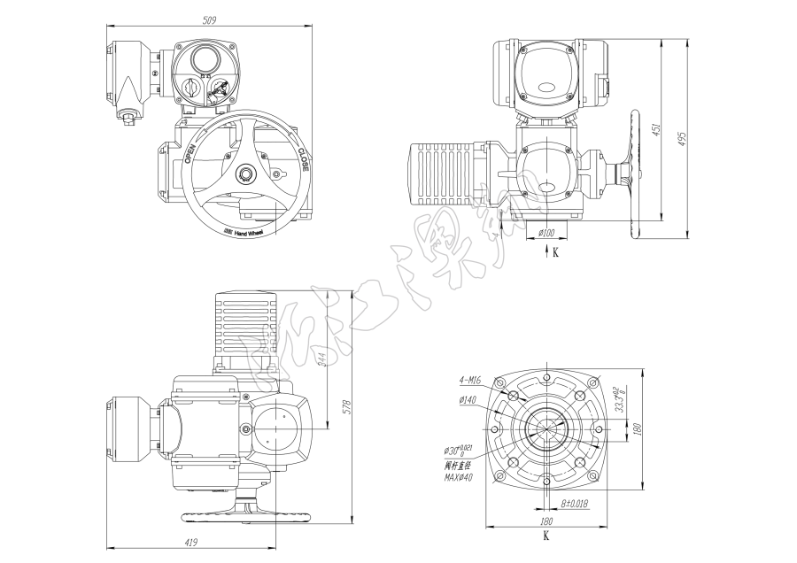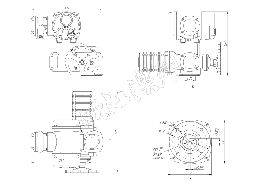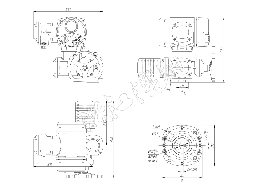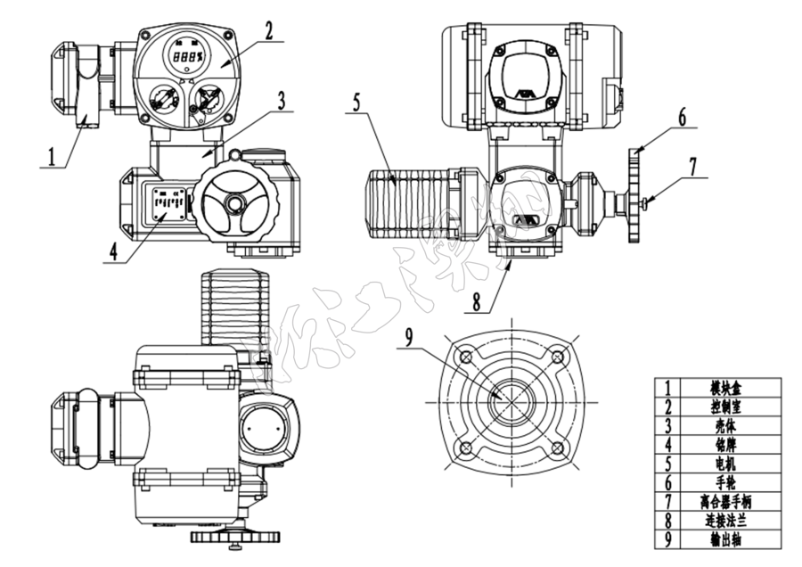 底部安裝尺寸符合ISO5210標(biāo)準(zhǔn),驅(qū)動(dòng)軸套可拆下根據(jù)需要進(jìn)行加工,兼容性好。可以垂直安裝,也可以水平安裝。