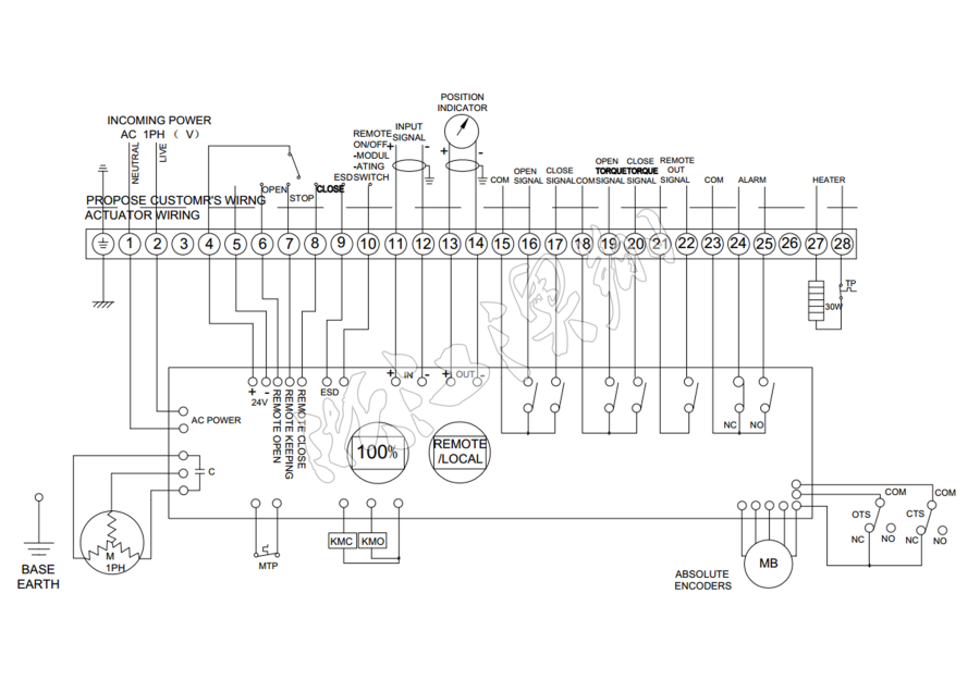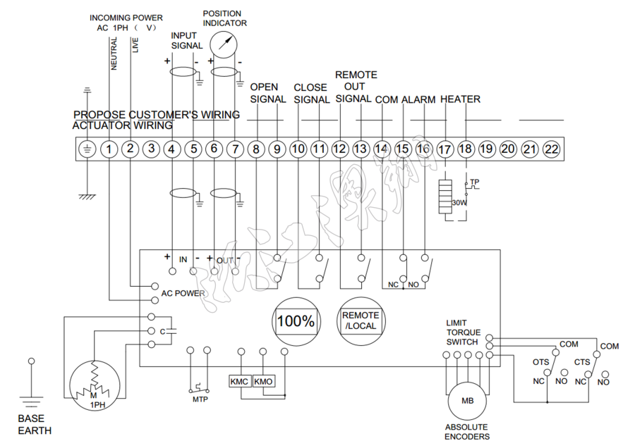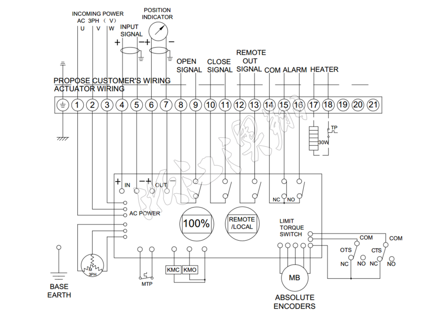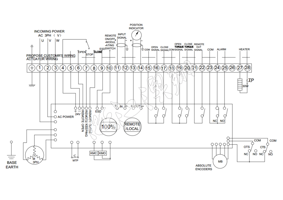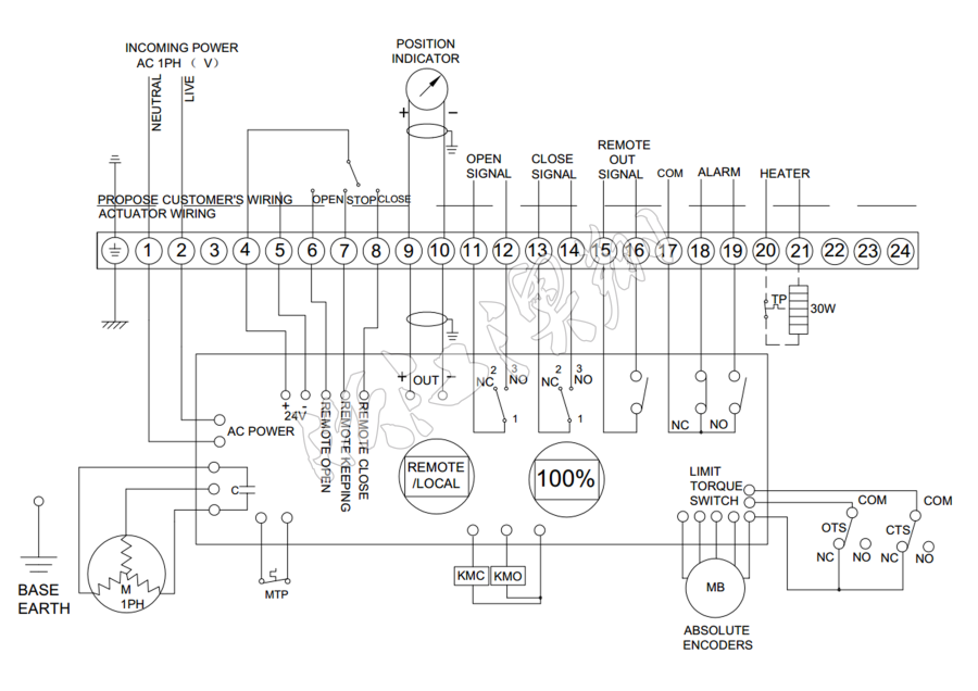 控制線路符合單相或三相電源標(biāo)準(zhǔn),線路布置緊湊合理。執(zhí)行器采用葵花端子配置29個(gè)接線端口,雙密封連接時(shí)端子臺(tái)安裝于執(zhí)行器腔體和連接器之間。即使在取下外蓋后或是電纜封套沒有完全密封的情況下,也可保護(hù)設(shè)備免于塵土或濕氣的侵害。接線端子可有Xiao滿足各種附加功能的要求。(可根據(jù)客戶要求另行加工)